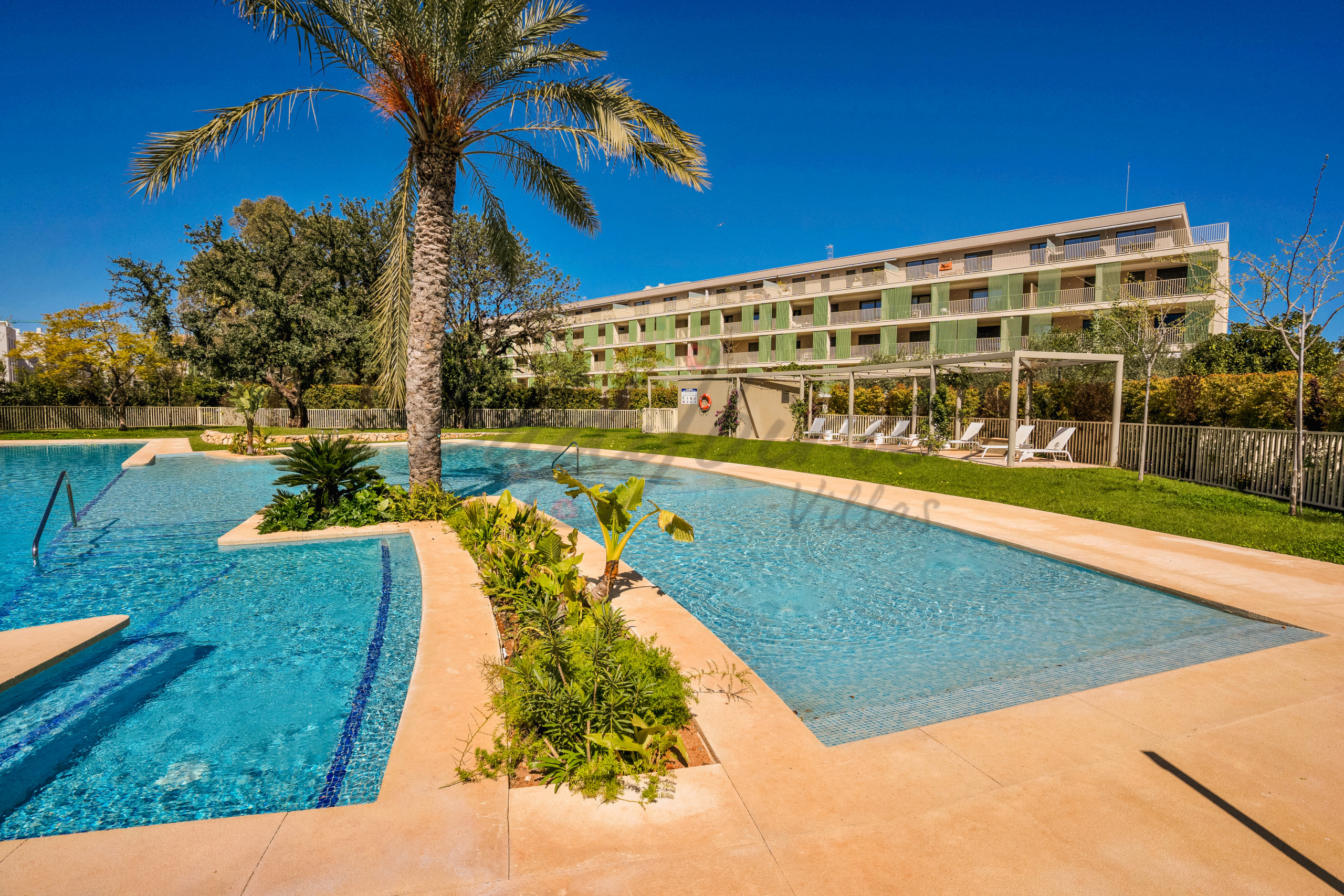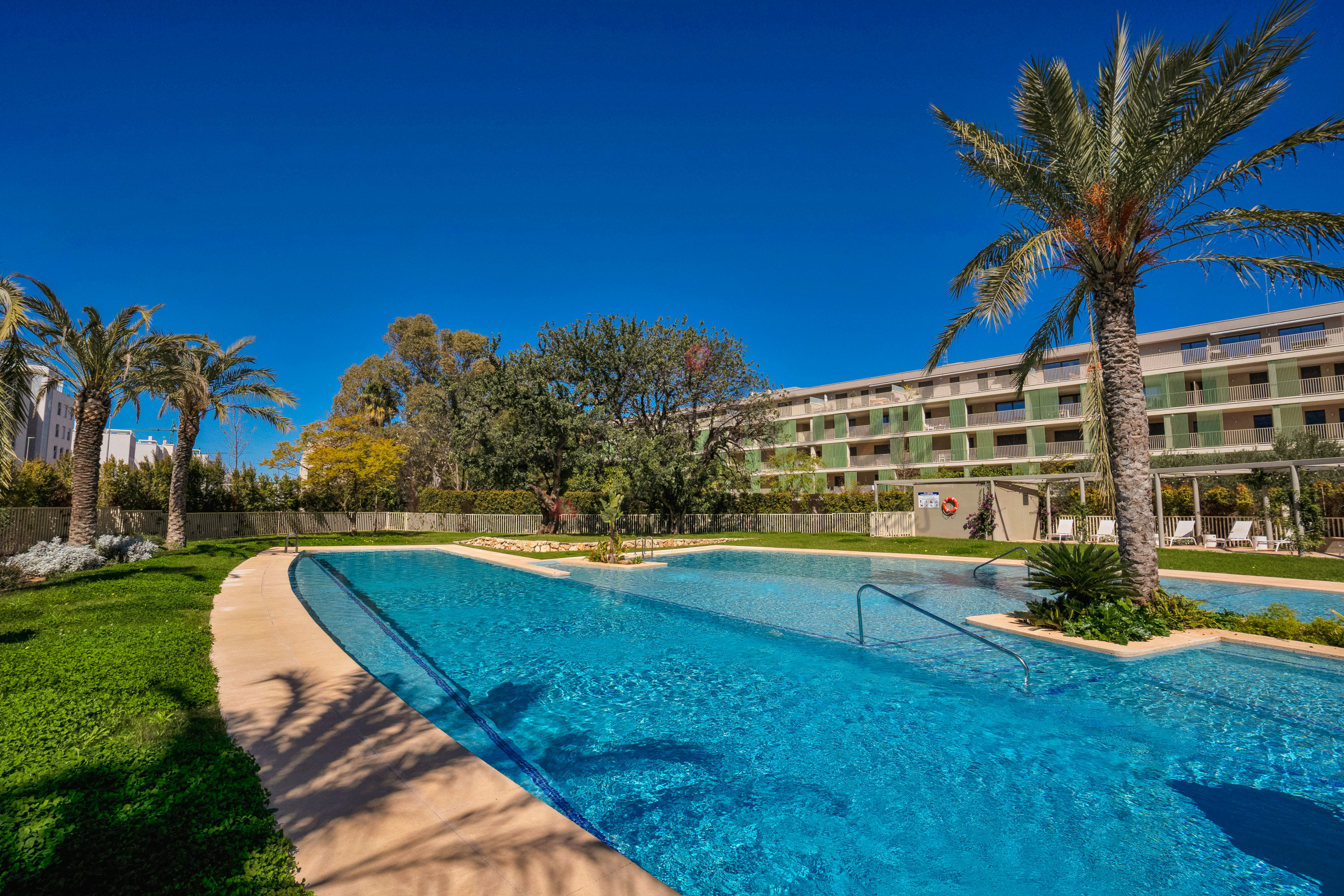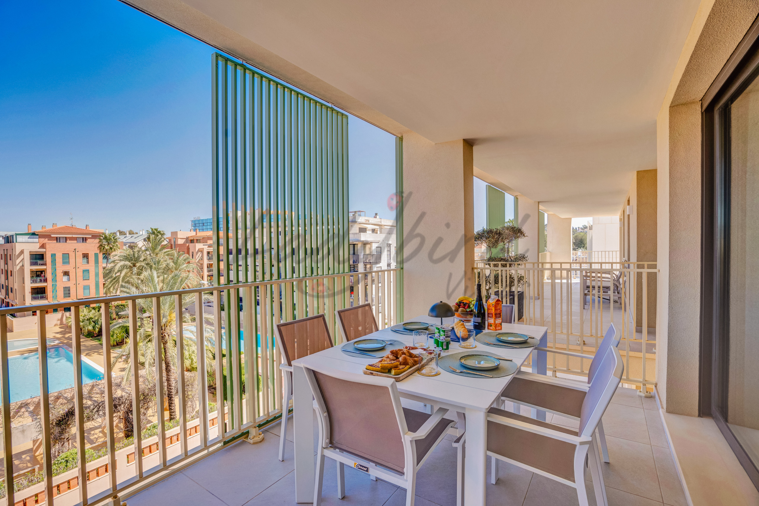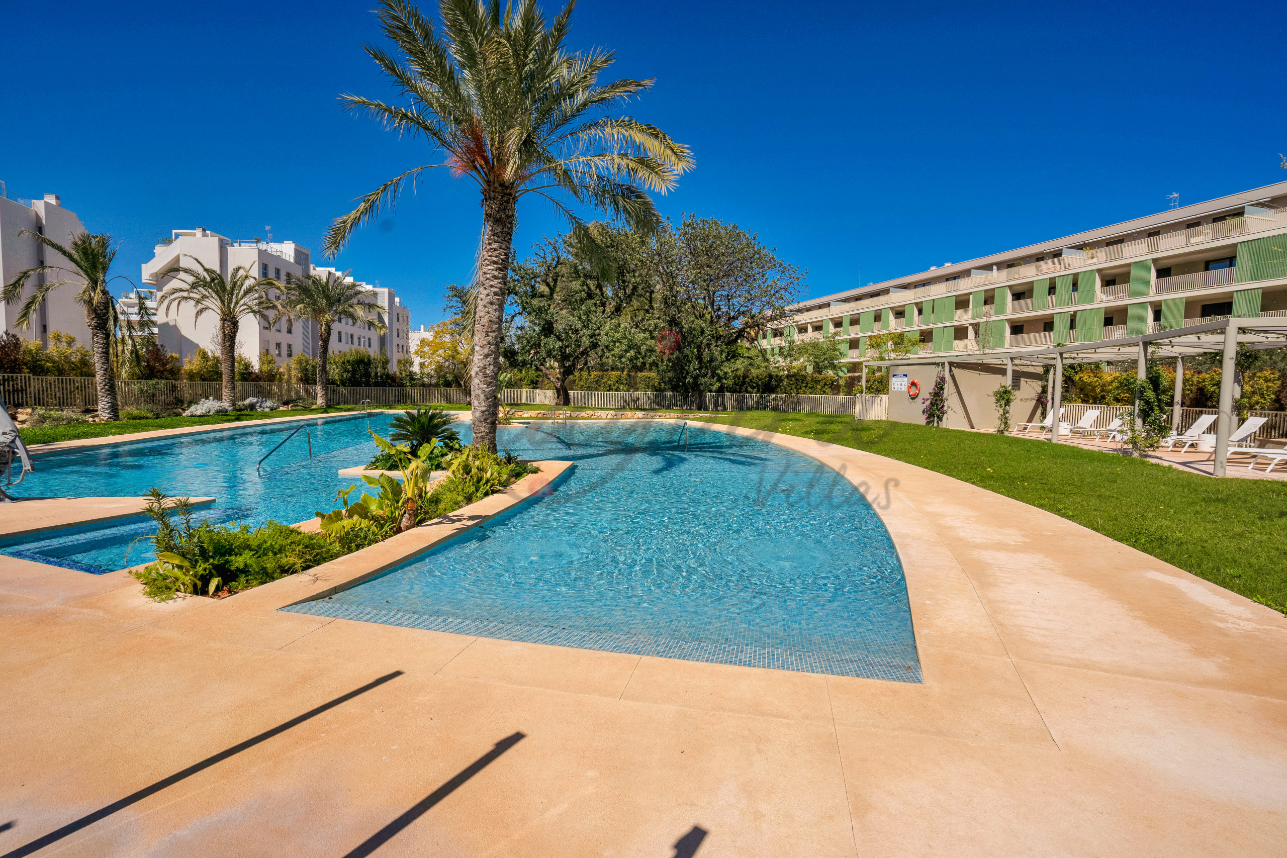 The apartment is on the first floor overlooking the communal swimming pool, from its south facing terrace.