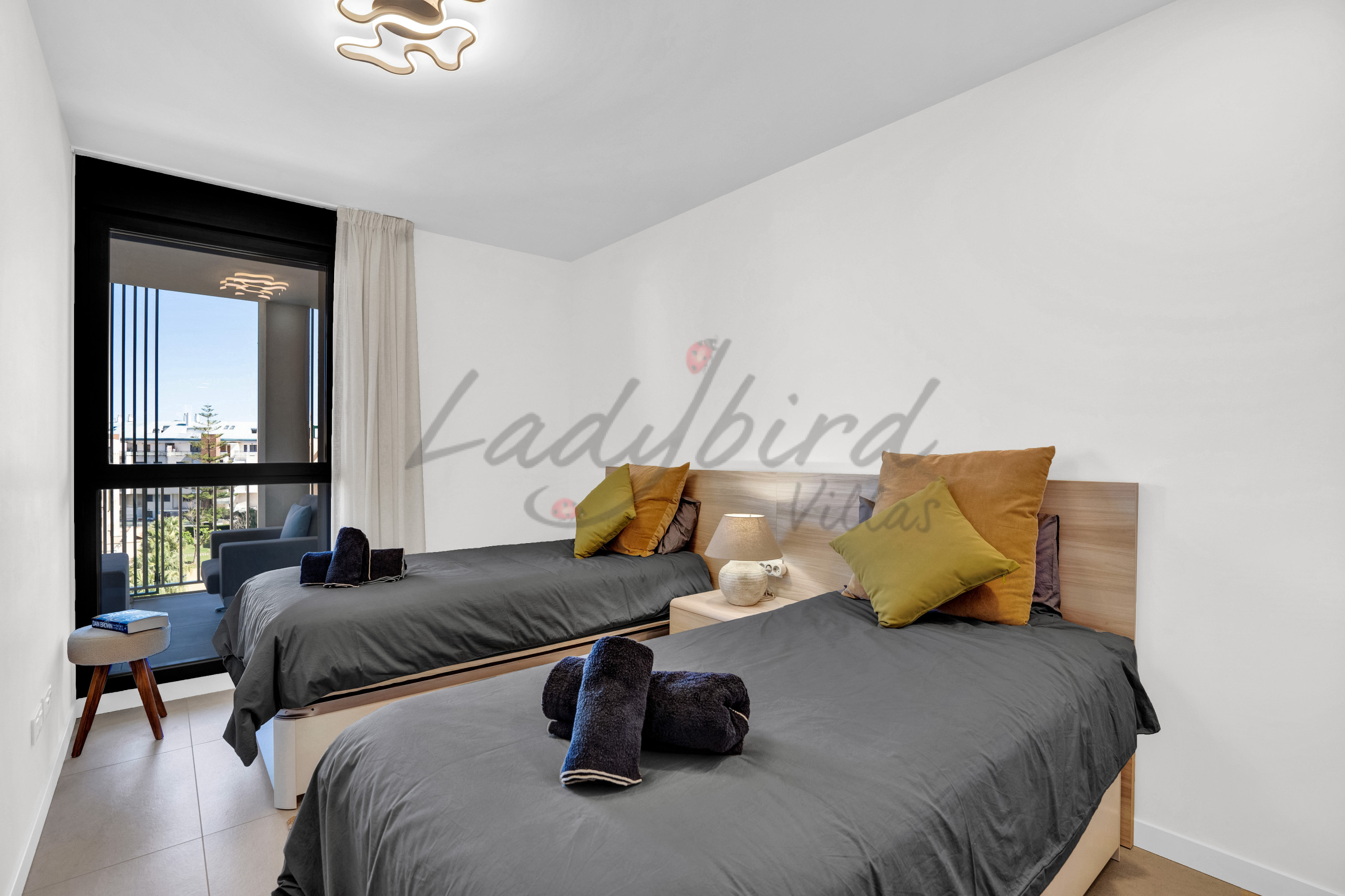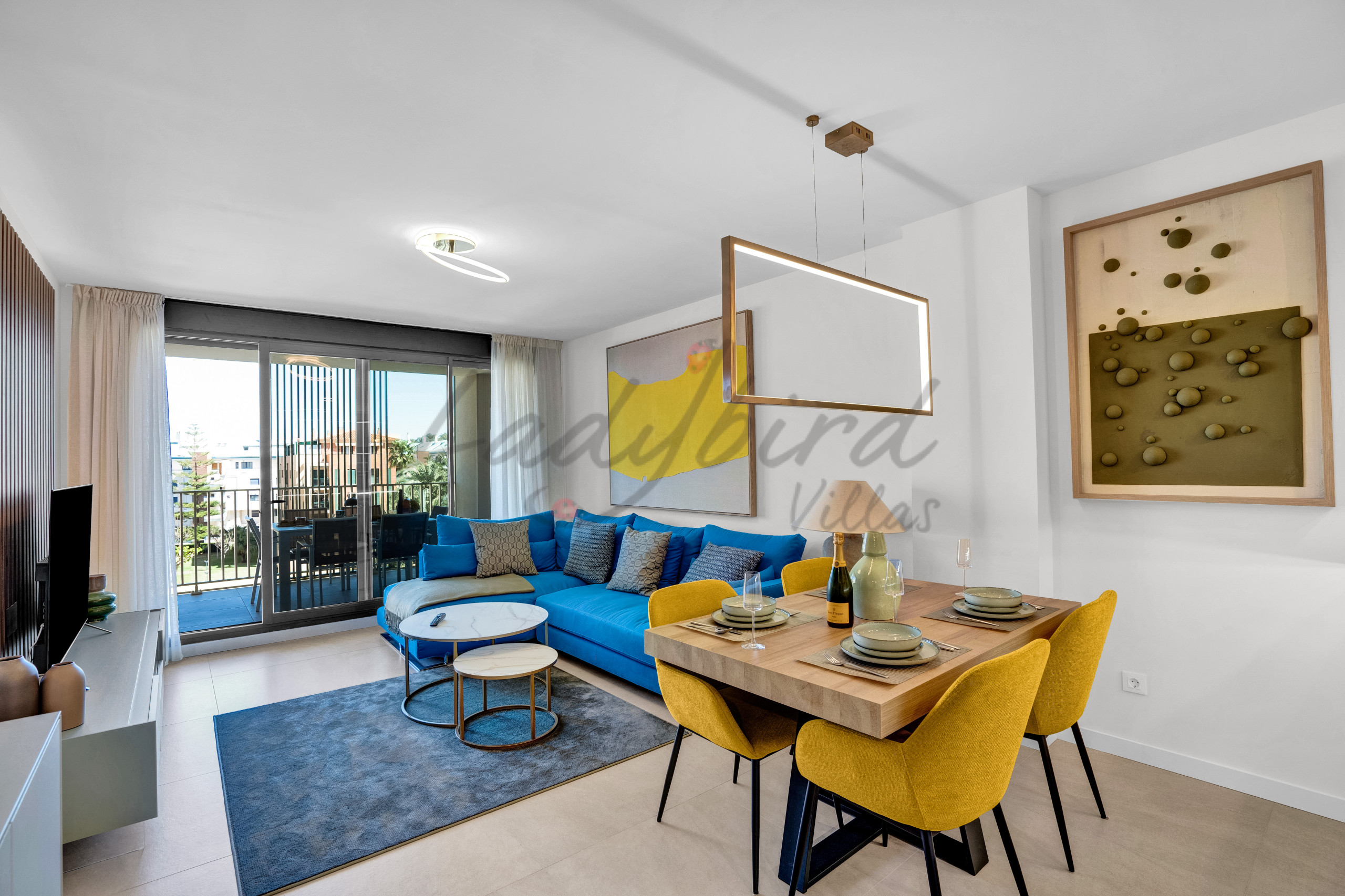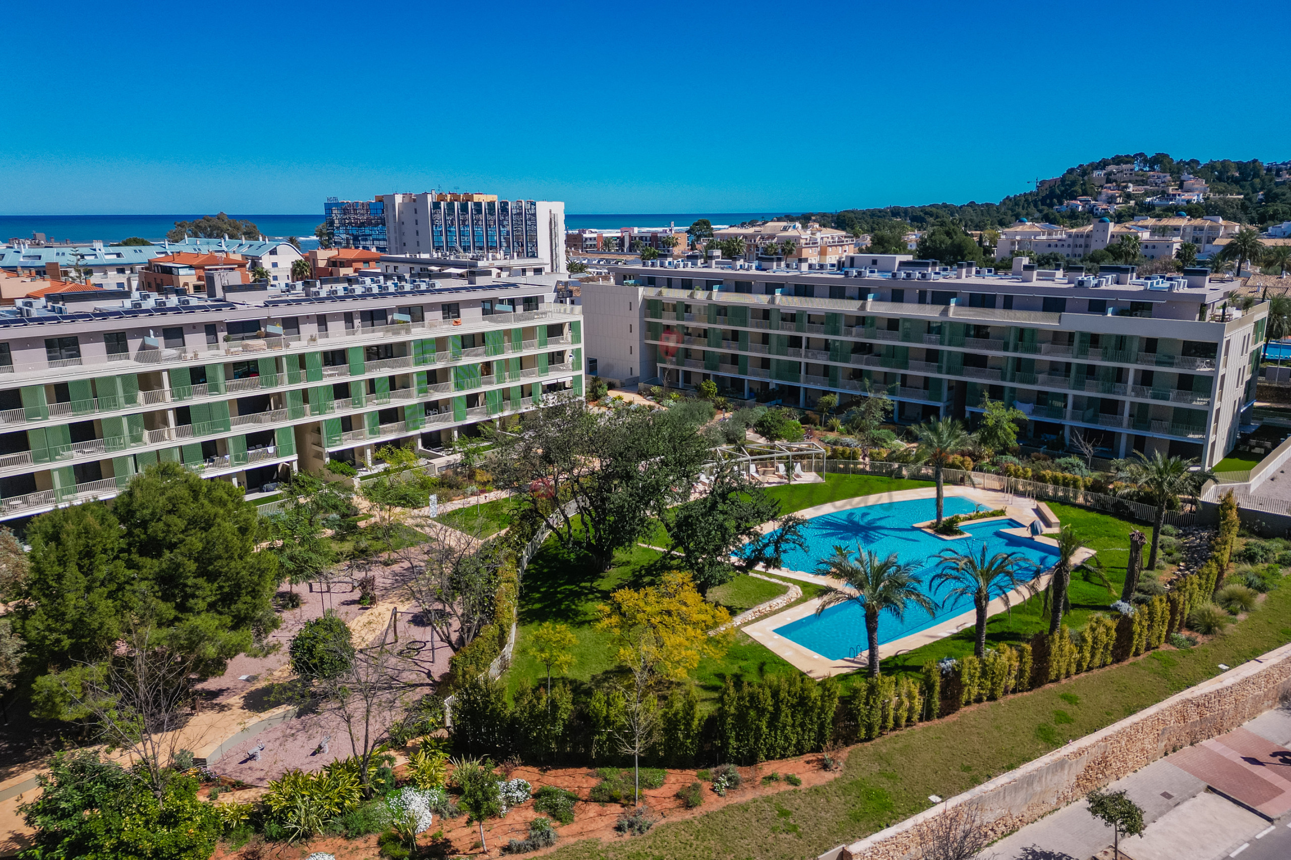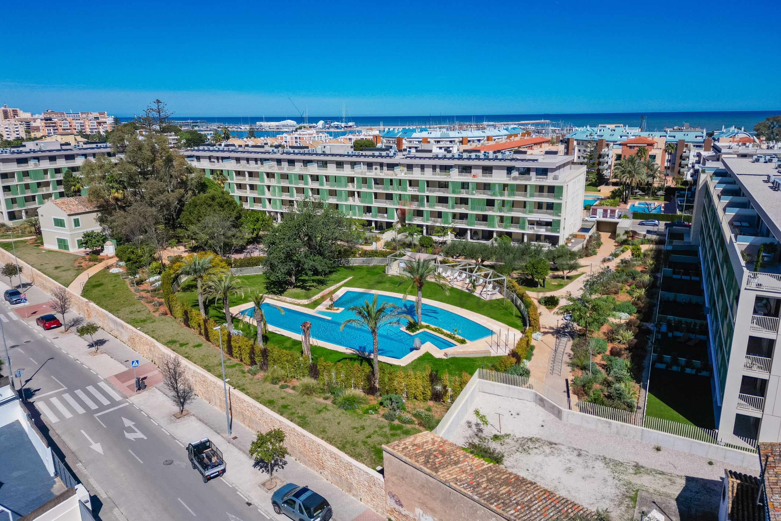 The apartment is on the first floor overlooking the communal swimming pool, from its south facing terrace.