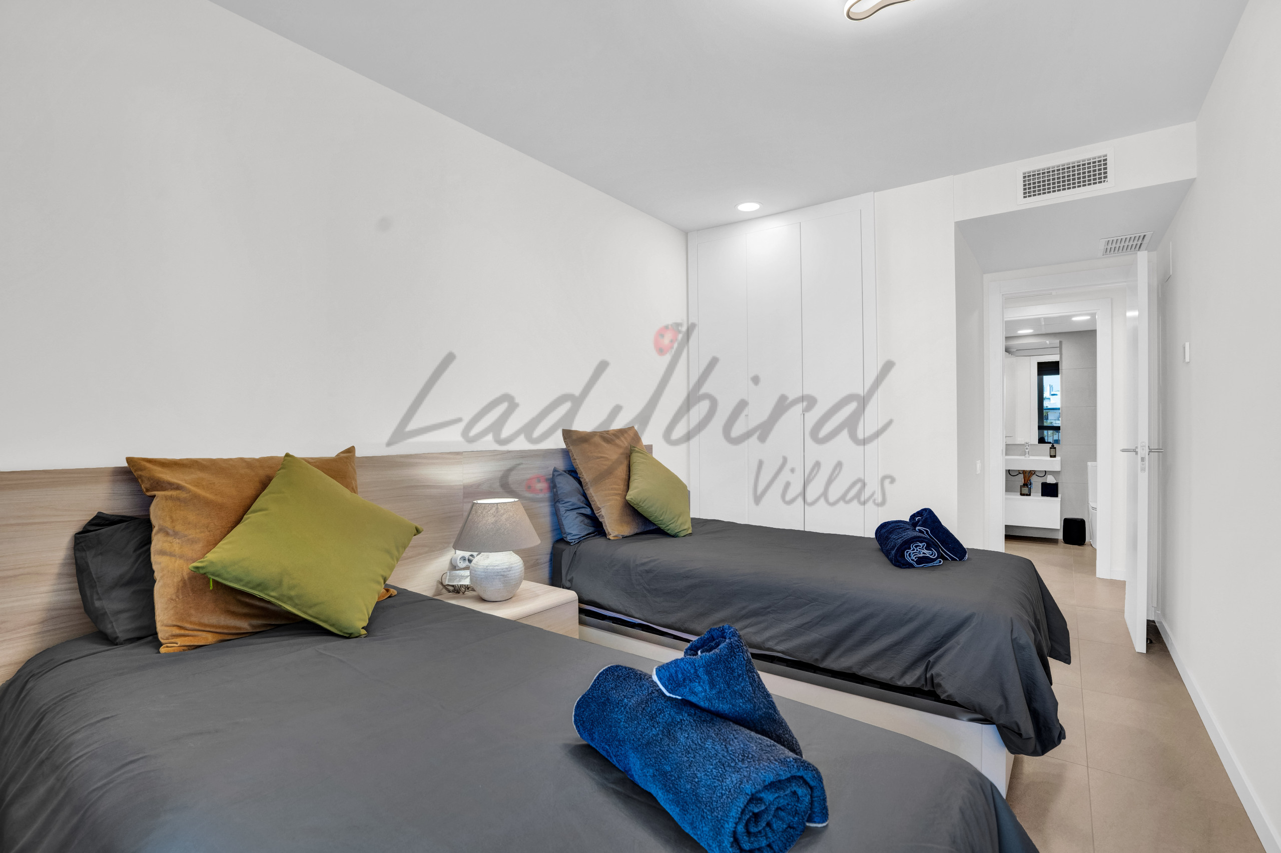 The master bed has A/C and king size bed. The additional two bedrooms both have a single bed in each and fans.